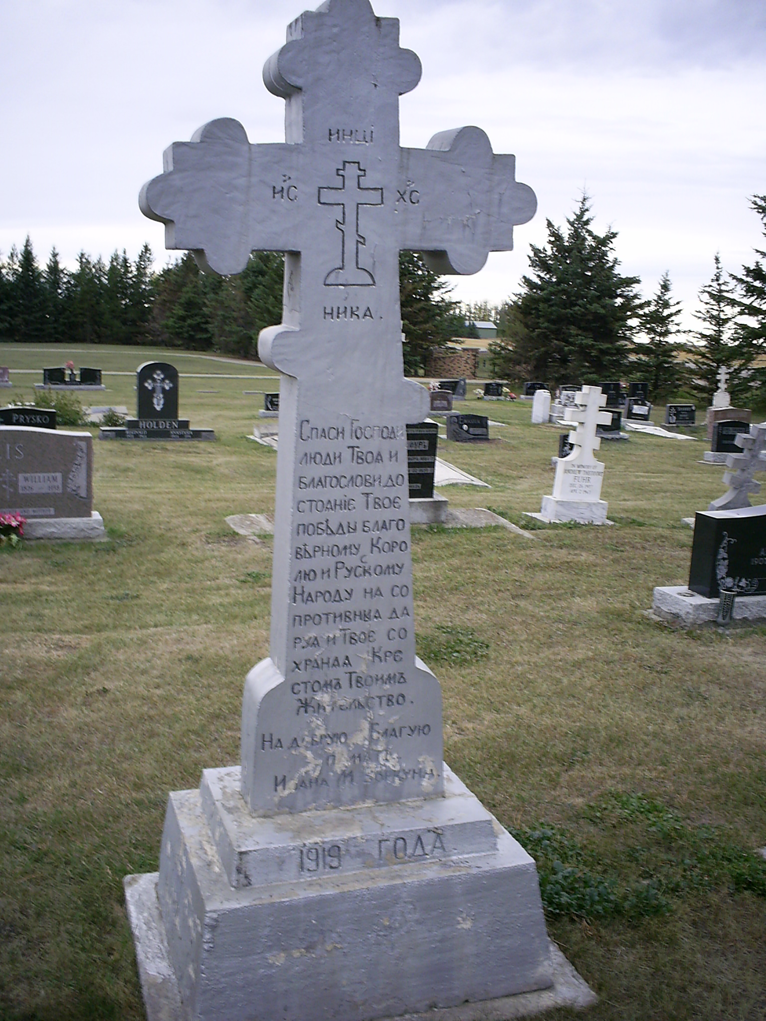 Памятный русинский крест на приходском кладбище при храме Рождества Богородицы на Ниску с надписью тропаря Честному Кресту – молитвы за земное Отечество – нашу Святую Русь (в тексте благоверный король – это английский Георг V (1910—1922/1927), так как после убийства святого царя-страстотерпца Николая II, которого русины в Канаде почитали за своего Покровителя и горько оплакивали его убийство, у них не было уже царя, а «Русский Народ» первоначально был написан согласно русинской традиции с одним «с»). 1919 год.
