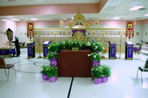 Внутренний вид молитвенного помещения Покровского прихода в Оттаве перед началом Великой вечерни Страстного Пятка.