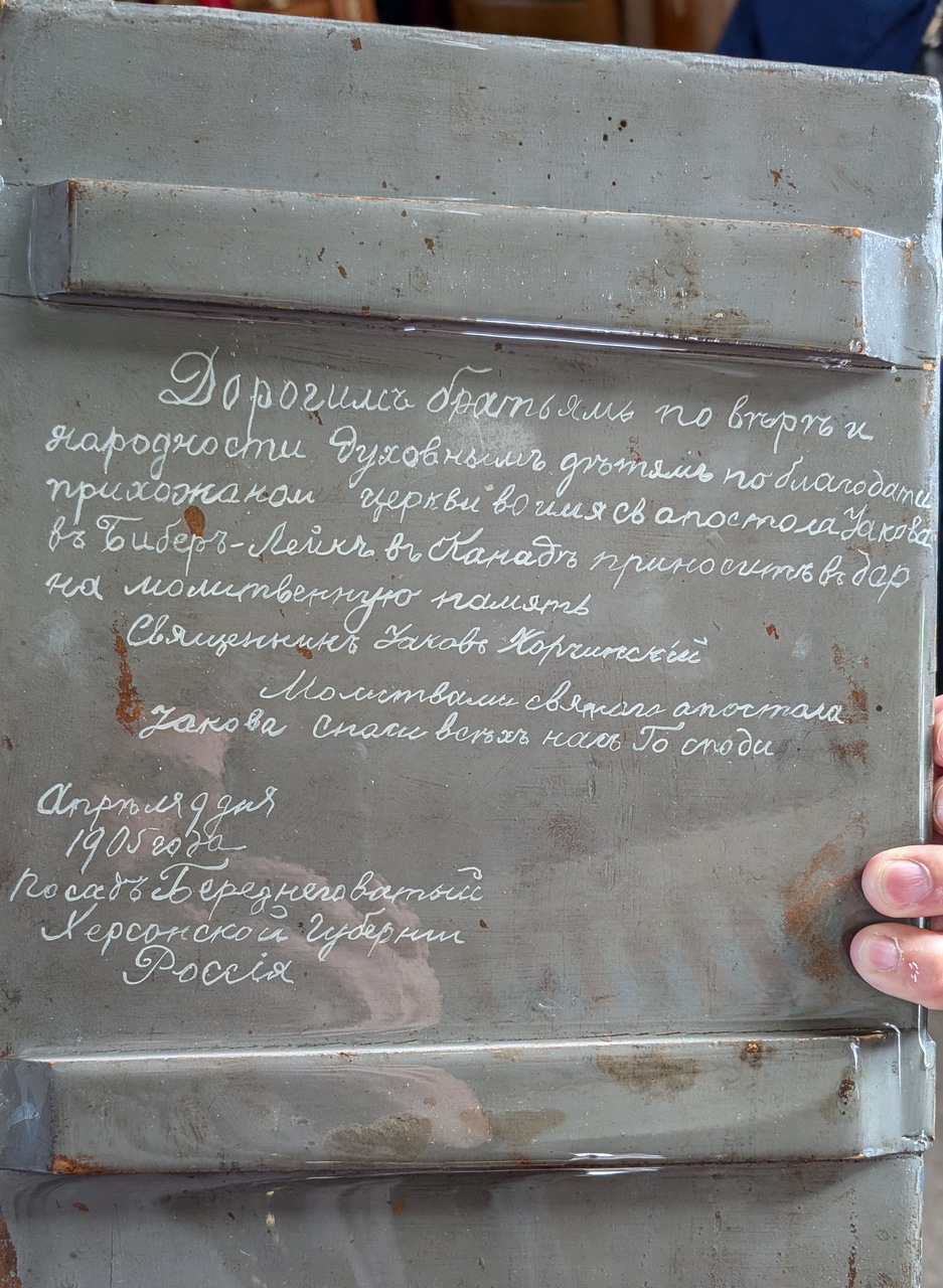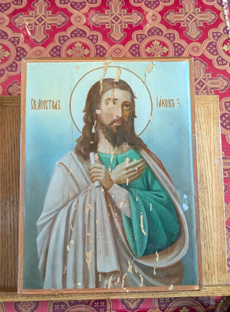 Father Alexios recently made a marvelous discovery on the back side of one of the oldest parish icons – of St. Jacob, and found and restored, based only on the pressure marks left after the handwriting of the Holy Martyr and the first priest, that appeared to be Father Jacob’s inscription of the gift on this icon to his “brothers in faith and nation and the spiritual children…” dated by April 1905.
