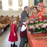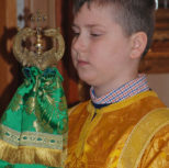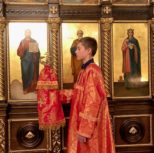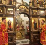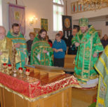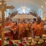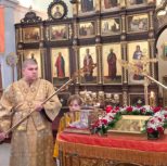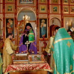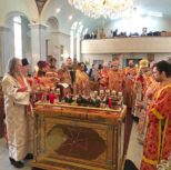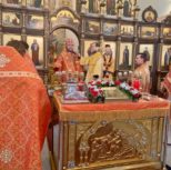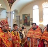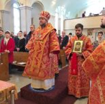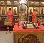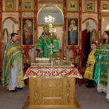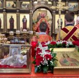 По заамвонной молитве Преосвященный Владыка и сослужащее духовенство совершили молебное пение перед иконой и десницей святой великомученицы Варвары.