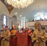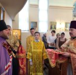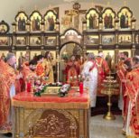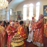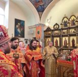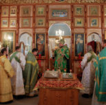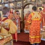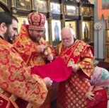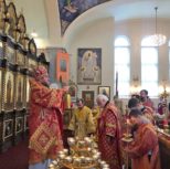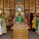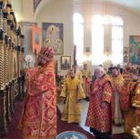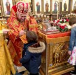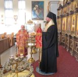 По заамвонной молитве из алтаря собора была изнесена десница святой великомученицы Варвары. Преосвященный архипастырь и сослужащее духовенство совершили молебное пение перед образом и святыми мощами великомученицы, после чего Владыка Матфей обратился с поздравительным словом по случаю престольного дня к духовенству и прихожанам собора.