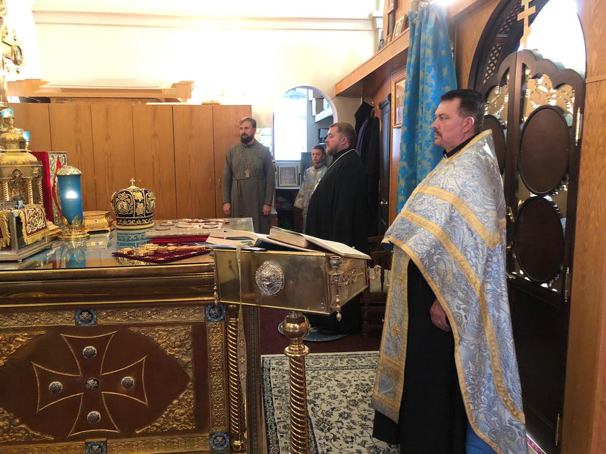 His Grace was assisted by Archpriest Igor Kisil, Dean of patriarchal parishes in the province of Alberta and Saskechevan, Rector of St. Barbara Cathedral, Archpriest Vitaly Manoli, Archpriest Yevgeny Protsenko, Head of the Information Department of Patriarchal parishes in Canada, and Deacon Andrey Boldyrev.