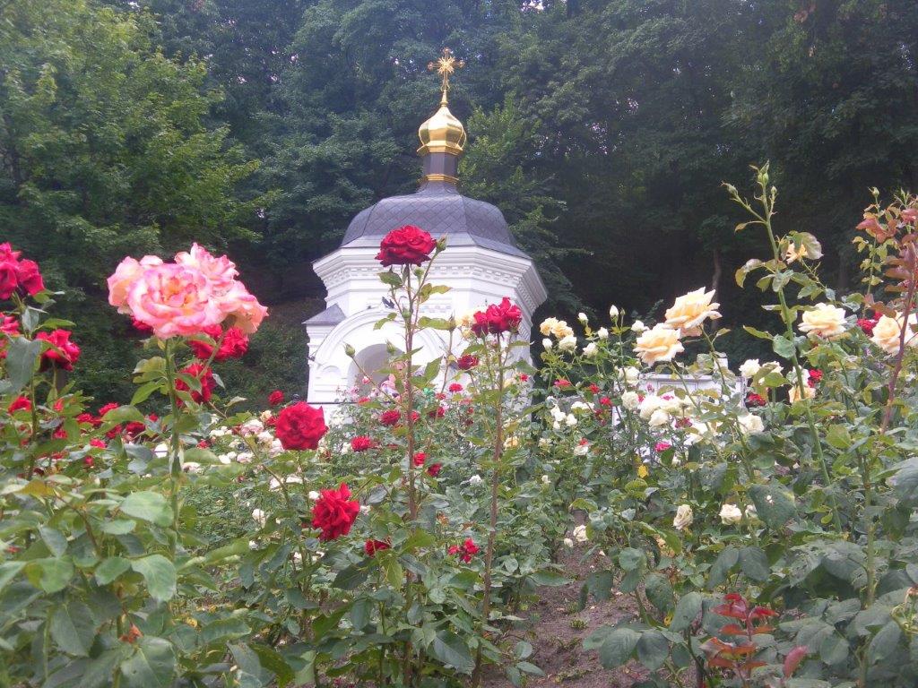 Современная часовня над источником прп. Феодосия Печерского под Дальними пещерами в окружении роз. Киево-Печерская Лавра. Киев.