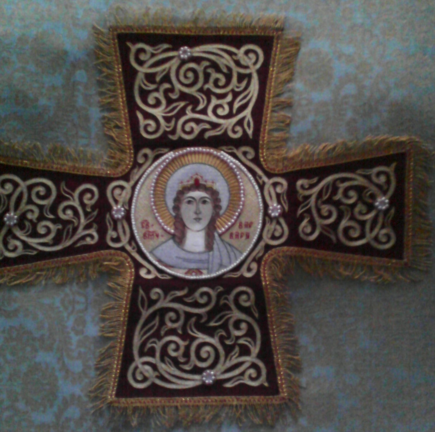 Вышивальница, безвозмездно изготовившая покровец по благословению епископа Каширского Иова, просит молитв о себе и своем сыне. Их имена — Ольга и Роман. Молитвенно благодарим рабу Божью Ольгу за огромный труд и прекрасную бесценную работу! Пусть святая великомученица Варвара, с любовью украшенная новой пеленой, своим ходатайством перед престолом Божиим поможет своей усердной почитательнице Ольге в ее трудах и молитвах, дарует ей и сыну все необходимое для спасения души и земной жизни!
