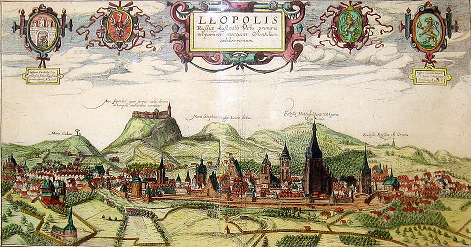 Средневековый православный руский Град Льва (Львов), называемый по греческой традиции "Леополис". Гравюра 1618г. Civitates Orbis Terrarum. Кельн. Мастер Абрам Гогенберг
