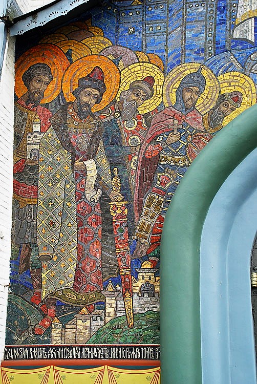 Св. князья Владимир Ярославич, Александр Невский, Михаил Тверской, Игорь Киевский и Ярополк-Петр Волынский. Южный портал Троицкого собора Почаевской лавры. Мозаика. Левая часть. Начало ХХ в.
